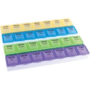 EZY DOSE Weekly AM/PM Pill Organizer, 7-Day Vitamin Container and Daily Medication Box with Large Pop-Out Compartments, 2 Times a Day Pill Holder, Blue and Purple Lids, Travel-Friendly Design