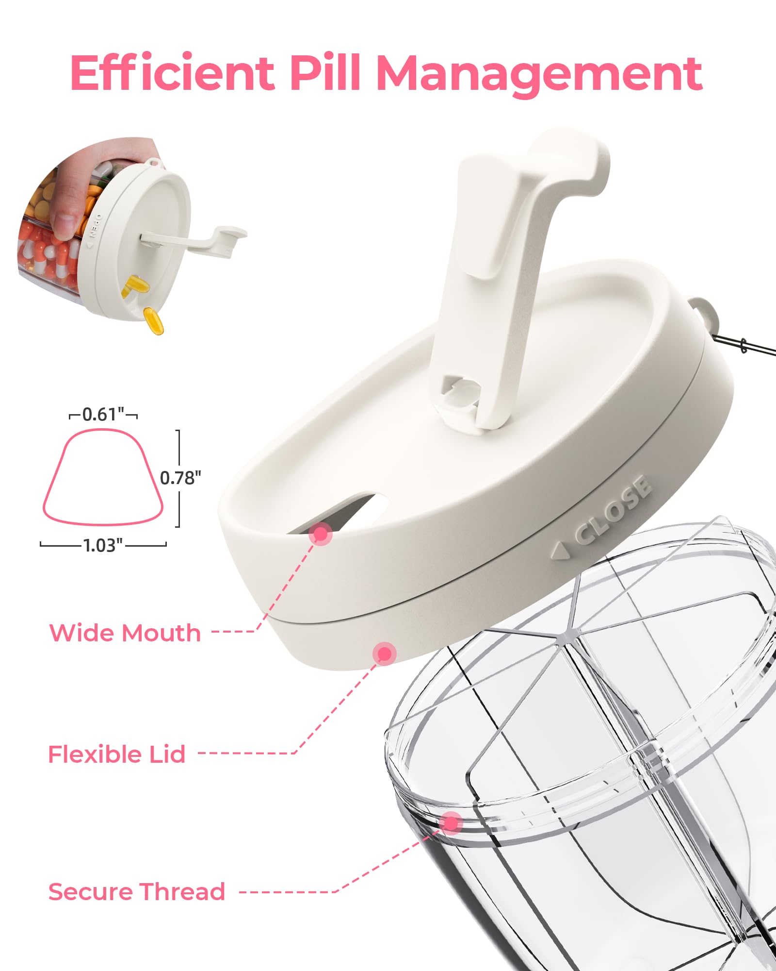 - Easy to Dispense: Thoughtfully designed with a stable threading, a flexible swivel lid and a large dispensing mouth, this vitamin organizer provides effortless pill access and simplifies your healthy routine with its user-friendly features