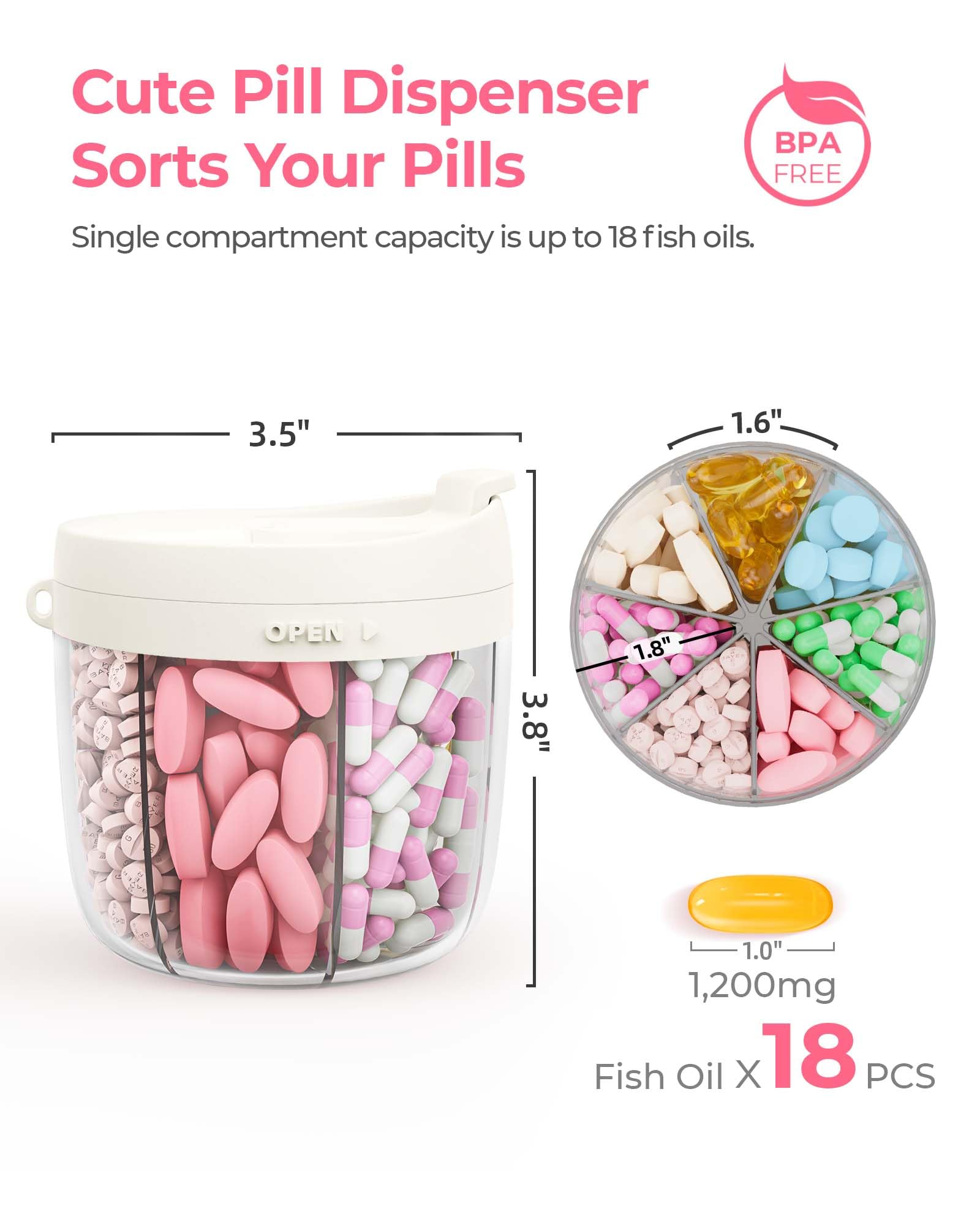 - Keep 7 Supplements in 1 Pill Holder: The pill organizer, designed with 7 compartments, holds 7 types of supplements, such as vitamins and calcium tablets, saving space and providing a more convenient choice for managing 7 pill bottles. Each compartment stores up to 18 fish oil capsules (each 1.0″ in length). The pill dispenser measures 3.8″ in height, with a 3.5″ top lid diameter, a 3.0″ bottom diameter, and weighs 5.4 ounces