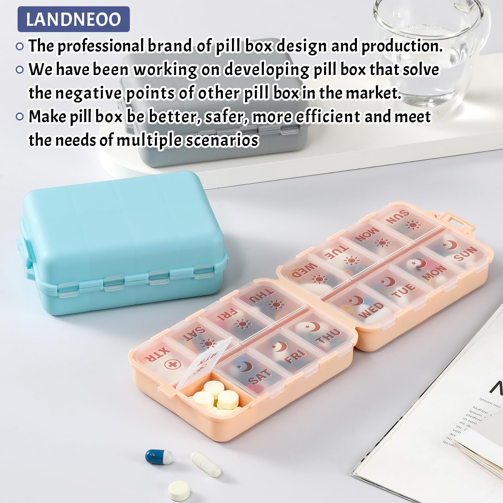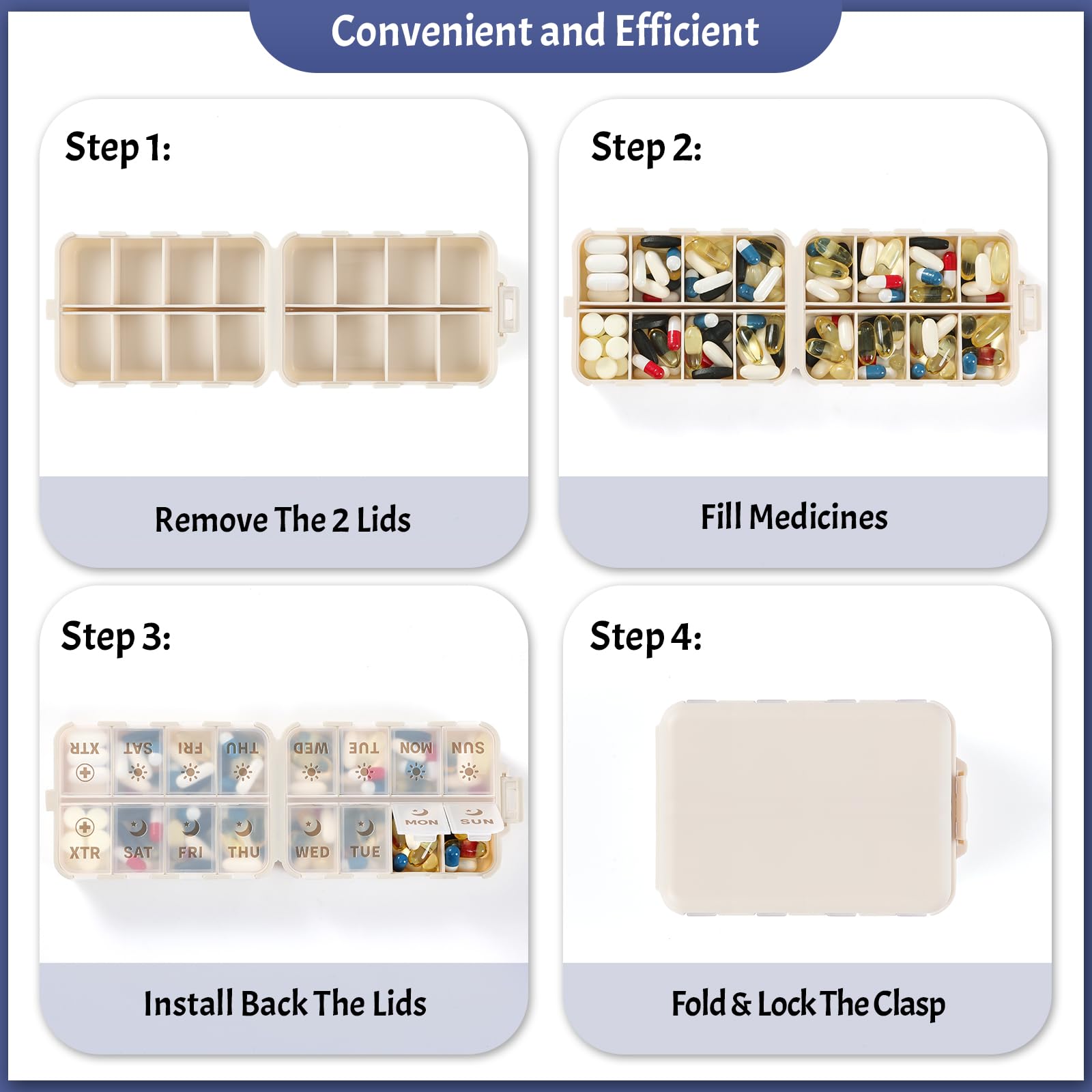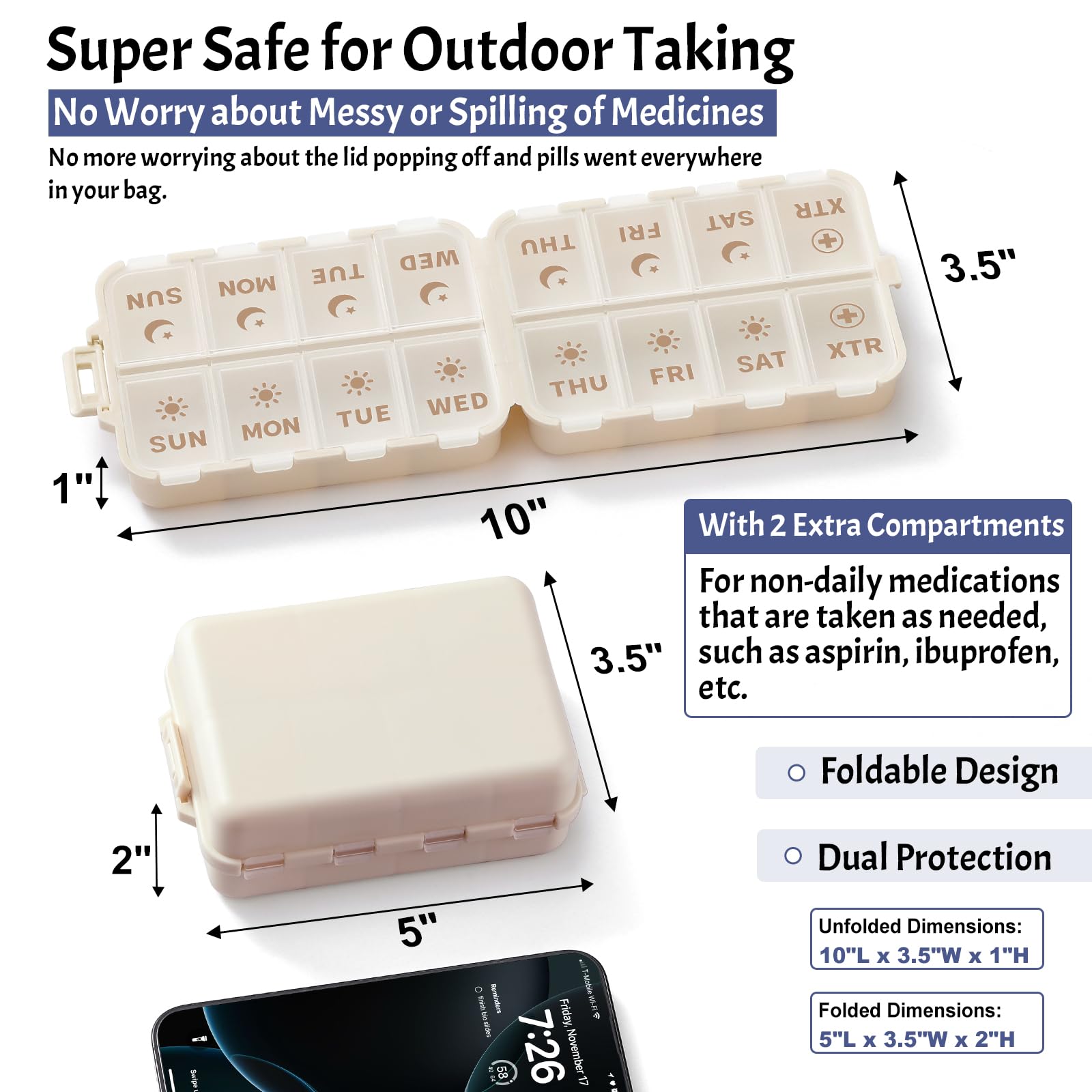 - Double Protection – Leak-Proof & Secure: Double-layer security: internal lids plus an external latch keep pills safely contained. Even when shaken or bumped, your medication stays secure with no risk of spills.