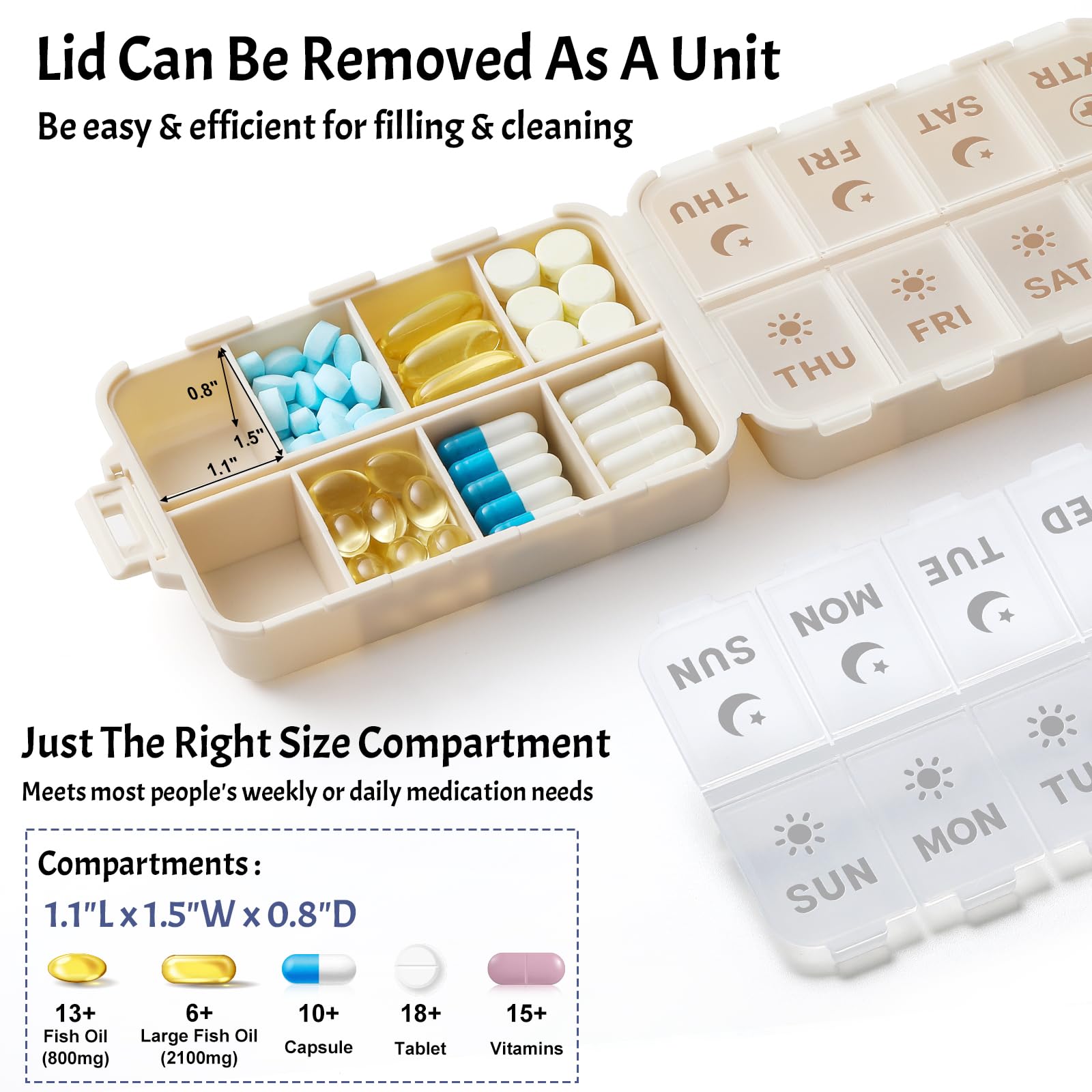 - Perfect Compartment Size – Hassle-Free Access: Each compartment is designed to hold a single dose of pills, vitamins, supplements, or fish oil. The snug yet easy-to-open lids offer a smooth user experience. The two extra/8th compartments can be used to store non-daily medications that are taken as needed, such as a**irin or i**profen.