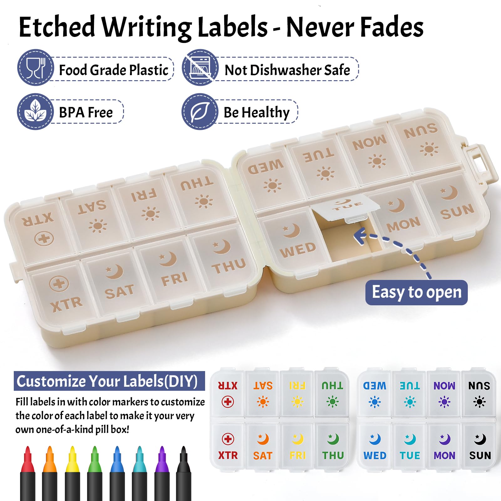 - Etched Label Design – Clear & Long-Lasting: The etched labels are wear-resistant and remain legible over time — no more fading or peeling like printed or handwritten tags. Customize your labels with color markers to create a personalized, one-of-a-kind pill organizer.