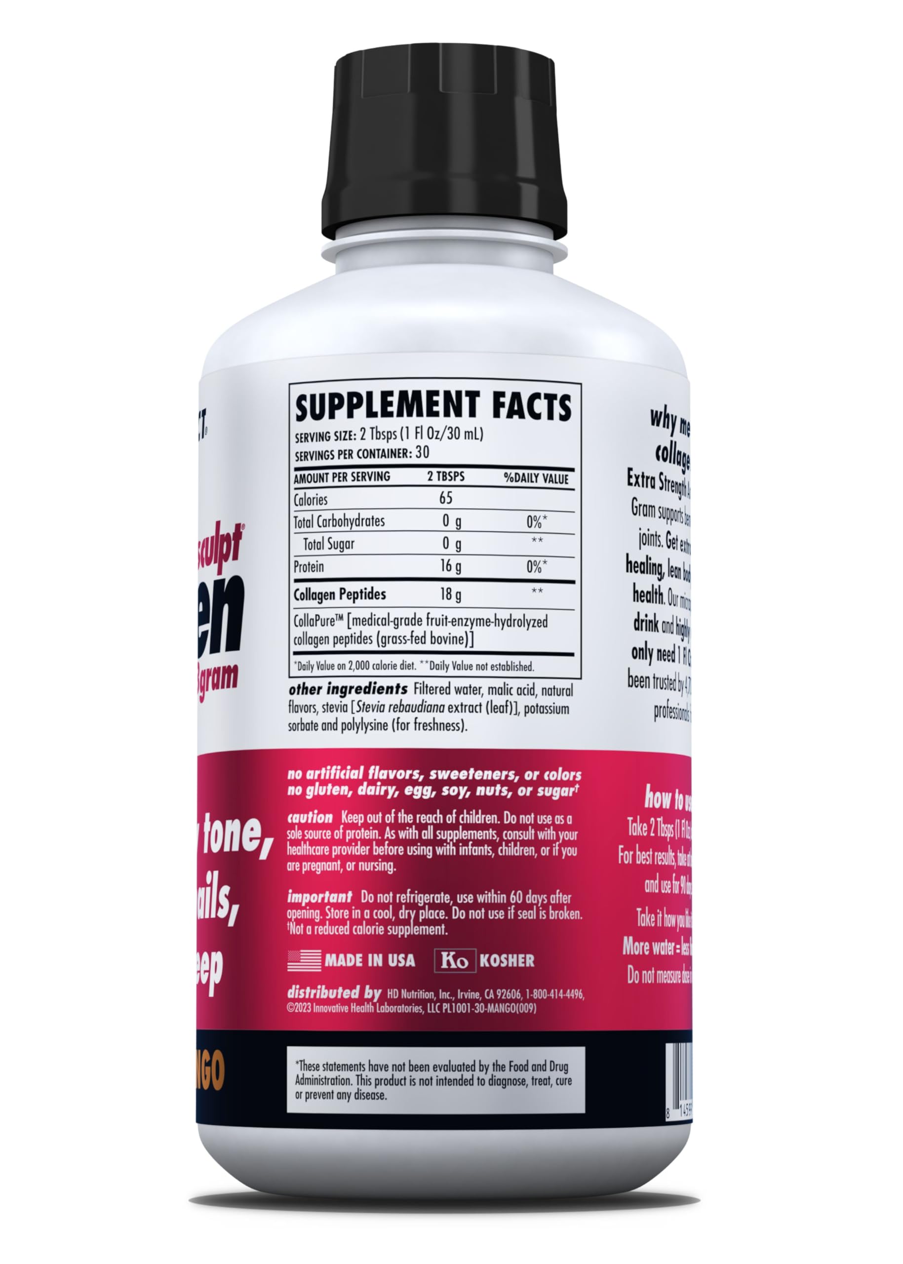 - Manufactured in the USA: Formulated and manufactured under GMPs outlined by the US FDA, AminoSculpt is made with pasture-raised, grass-fed bovine ensuring a high-quality, non-GMO collagen supplement. It’s also Kosher certified. Free of sugar, gluten, dairy, soy, and artificial additives, making it suitable for those with dietary restrictions.*