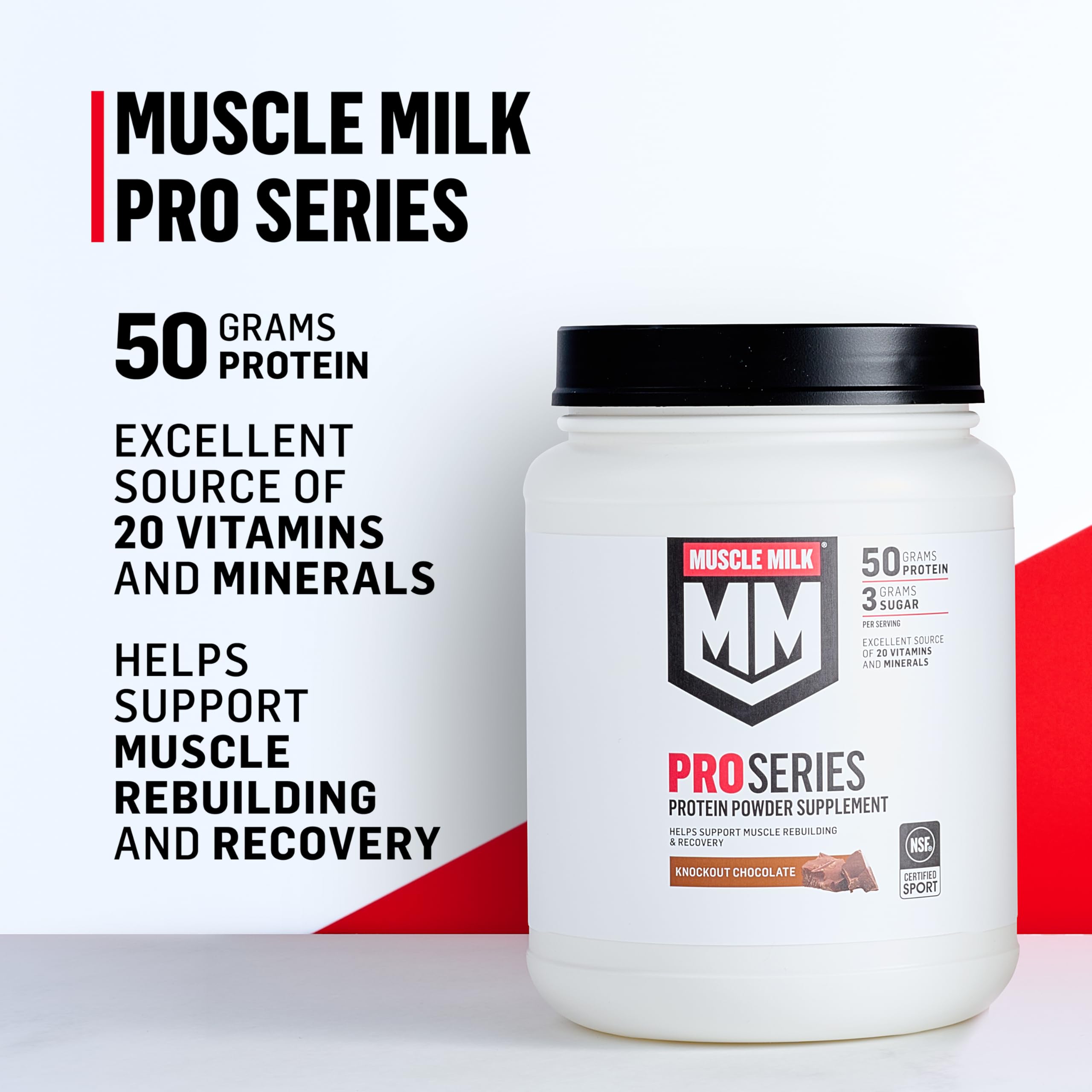 - KEY FEATURES – Based on 1 serving, Muscle Milk Pro Series Protein Powder contains 50g high-quality protein, 3g sugar, and an excellent source of 20 vitamins and minerals.