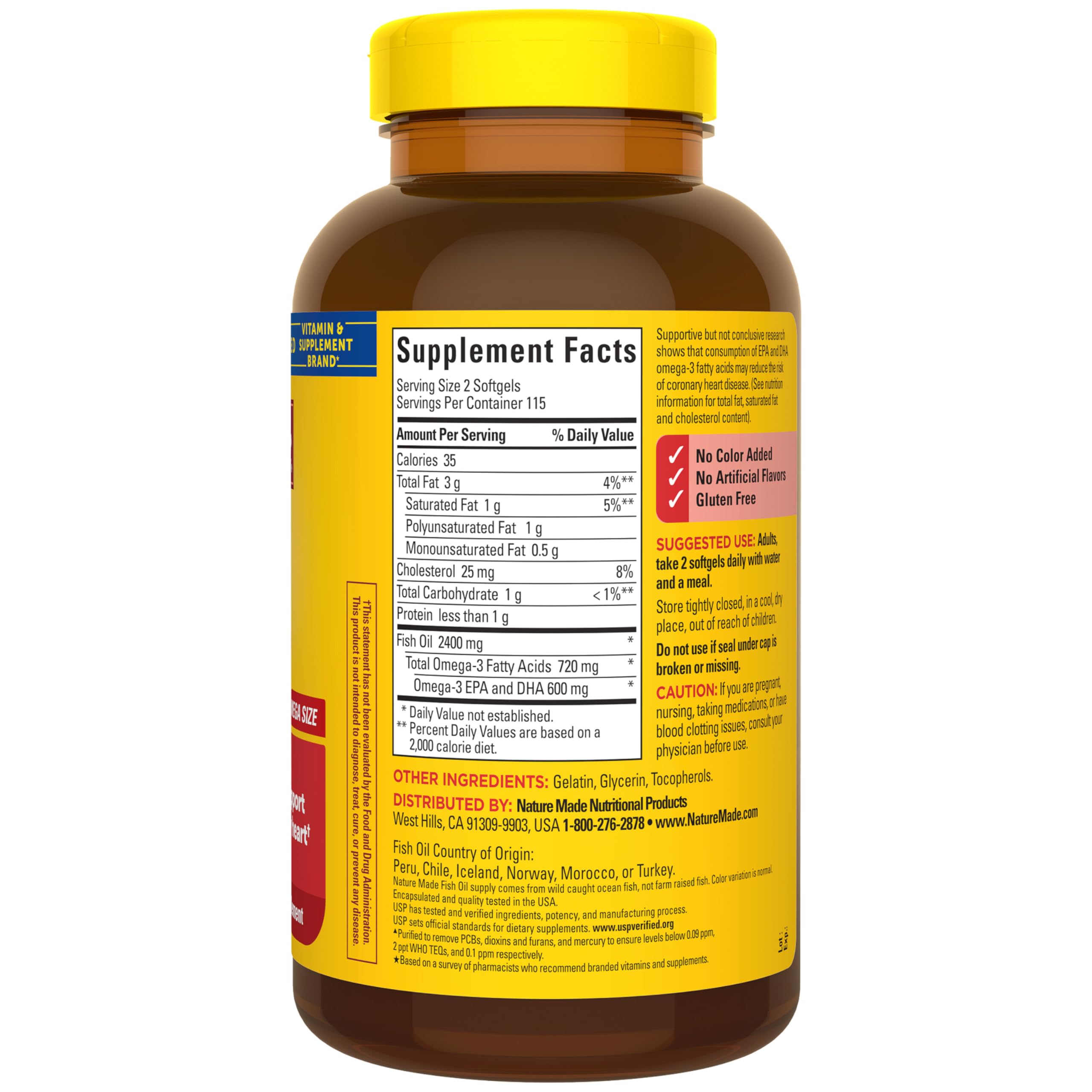 Details: Nature Made Fish Oil 1200 mg is a dietary supplement that provides 360 mg Omega-3 fatty acids per softgel to help support a healthy heart. A serving of two Nature Made Omega 3 Fish Oil 1200 mg softgels provides 2400 mg Fish Oil with 720 mg Omega 3s (600 mg EPA and DHA). These gluten free Nature Made Fish Oil 1200 mg 360 mg Omega-3 supplements have no color added and no artificial flavors. These Fish Oil supplements are purified to remove mercury (2) from wild-caught ocean fish, not farm-raised fish. Adults, take two of these Omega 3 Fish Oil softgels daily with water and a meal. An Omega 3 supplement like fish oil Nature Made can help provide Omega 3 Fish Oil for men and women. Nature Made DHA EPA Omega 3 supplements are quality you can trust. (2)Purified to remove PCBs, dioxins and furans, and mercury to ensure levels below 0.09 ppm, 2 ppt WHO TEQs, and 0.1 ppm respectively. *Based on a survey of pharmacists who recommend branded vitamins and supplements. These statements have not been evaluated by the Food and Drug Administration. This product is not intended to diagnose, treat, cure or prevent any disease.