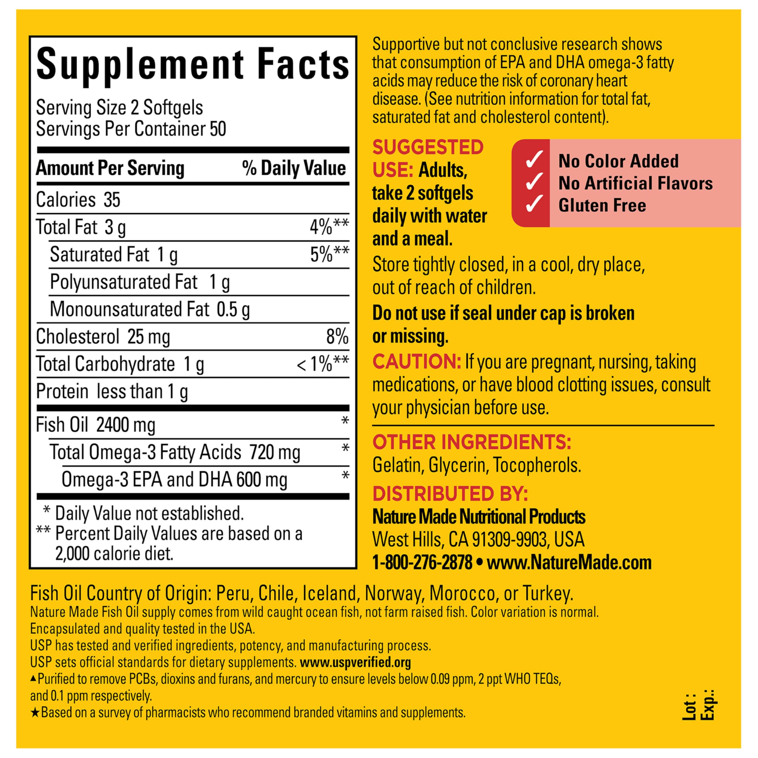 Nature Made Fish Oil 1200 mg is a dietary supplement that provides 360 mg Omega-3 fatty acids per softgel to help support a healthy heart. A serving of two Nature Made Omega 3 Fish Oil 1200 mg softgels provides 2400 mg Fish Oil with 720 mg Omega 3s (600 mg EPA and DHA). These gluten free Nature Made Fish Oil 1200 mg 360 mg Omega-3 supplements have no color added and no artificial flavors. These Fish Oil supplements are purified to remove mercury (2) from wild-caught ocean fish, not farm-raised fish. Adults, take two of these Omega 3 Fish Oil softgels daily with water and a meal. An Omega 3 supplement like fish oil Nature Made can help provide Omega 3 Fish Oil for men and women. Nature Made DHA EPA Omega 3 supplements are quality you can trust. (2)Purified to remove PCBs, dioxins and furans, and mercury to ensure levels below 0.09 ppm, 2 ppt WHO TEQs, and 0.1 ppm respectively. *Based on a survey of pharmacists who recommend branded vitamins and supplements. These statements have not been evaluated by the Food and Drug Administration. This product is not intended to diagnose, treat, cure or prevent any disease.