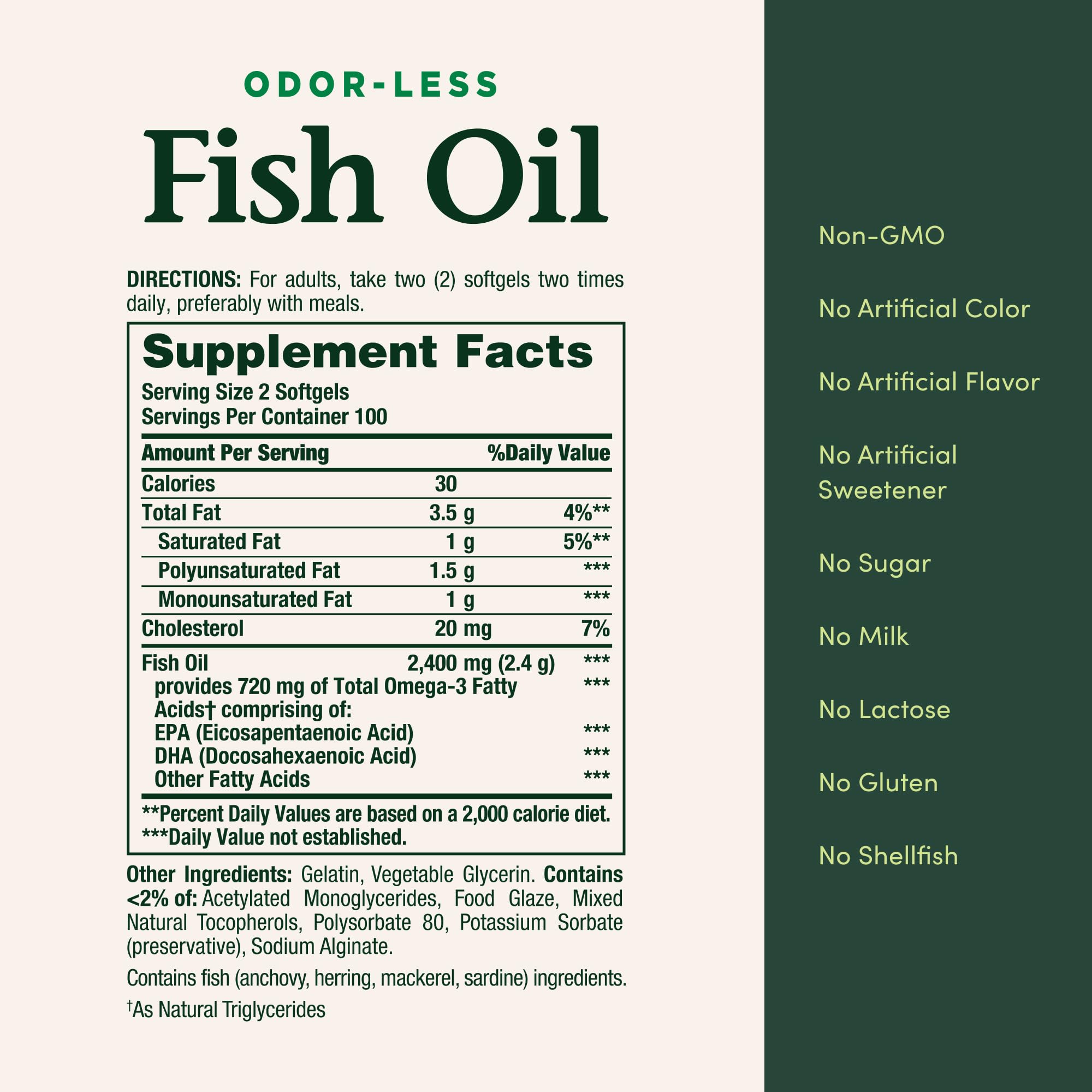 • ODOR FREE Nature’s Bounty Fish Oil Softgels are odorless and coated, so you can reap the benefits of your fish oil supplements in the morning without the fish burps.