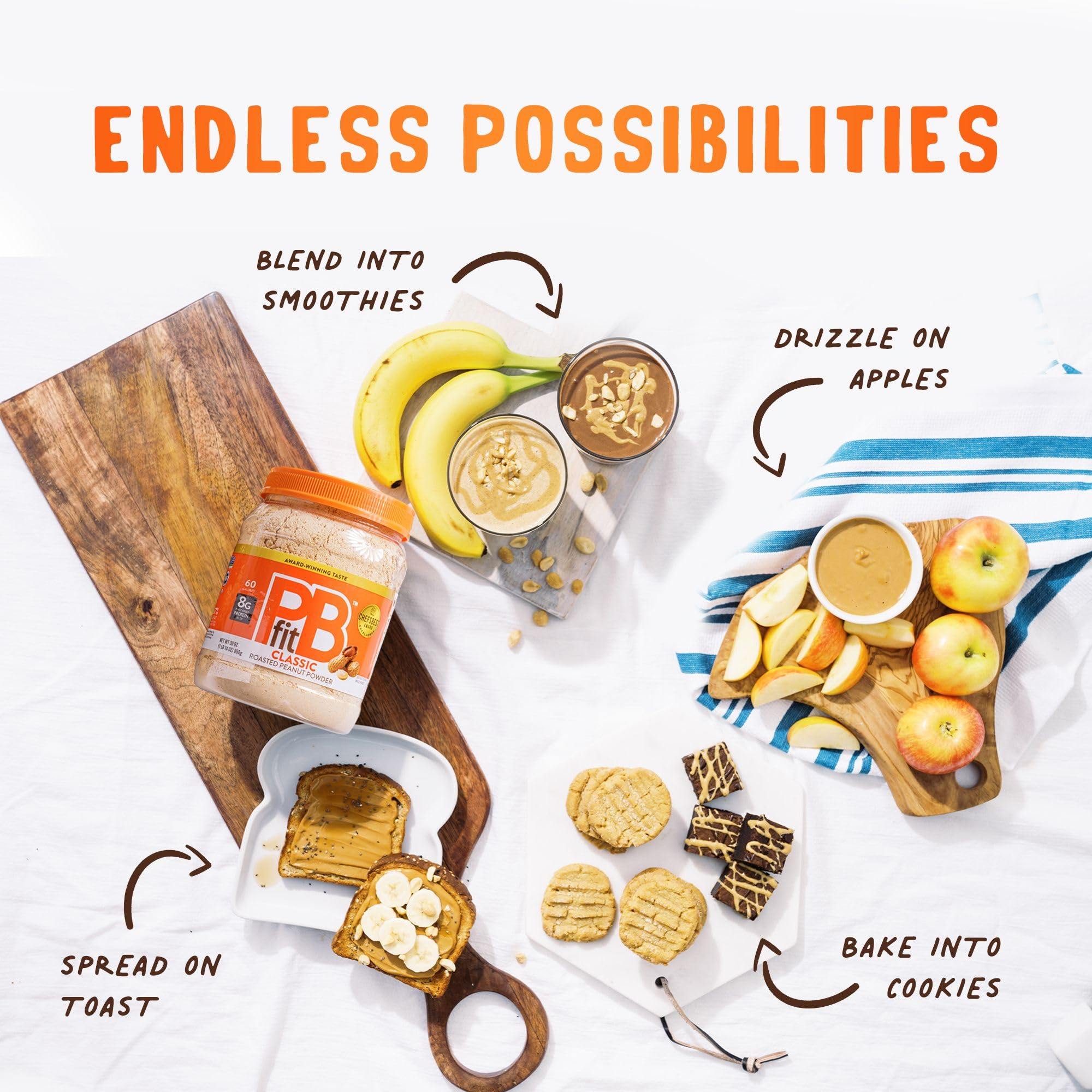 • BLEND, BAKE, OR SPREAD: when it comes to the uses for PBfit, the possibilities are endless! Mix into baked goods like bread, pancakes, waffles, and cookies to add a great peanut butter flavor. You can also blend it into breakfast smoothies and other drinks for a tasty, low-fat protein boost. It’s also great in yogurt, oatmeal, and in sandwiches