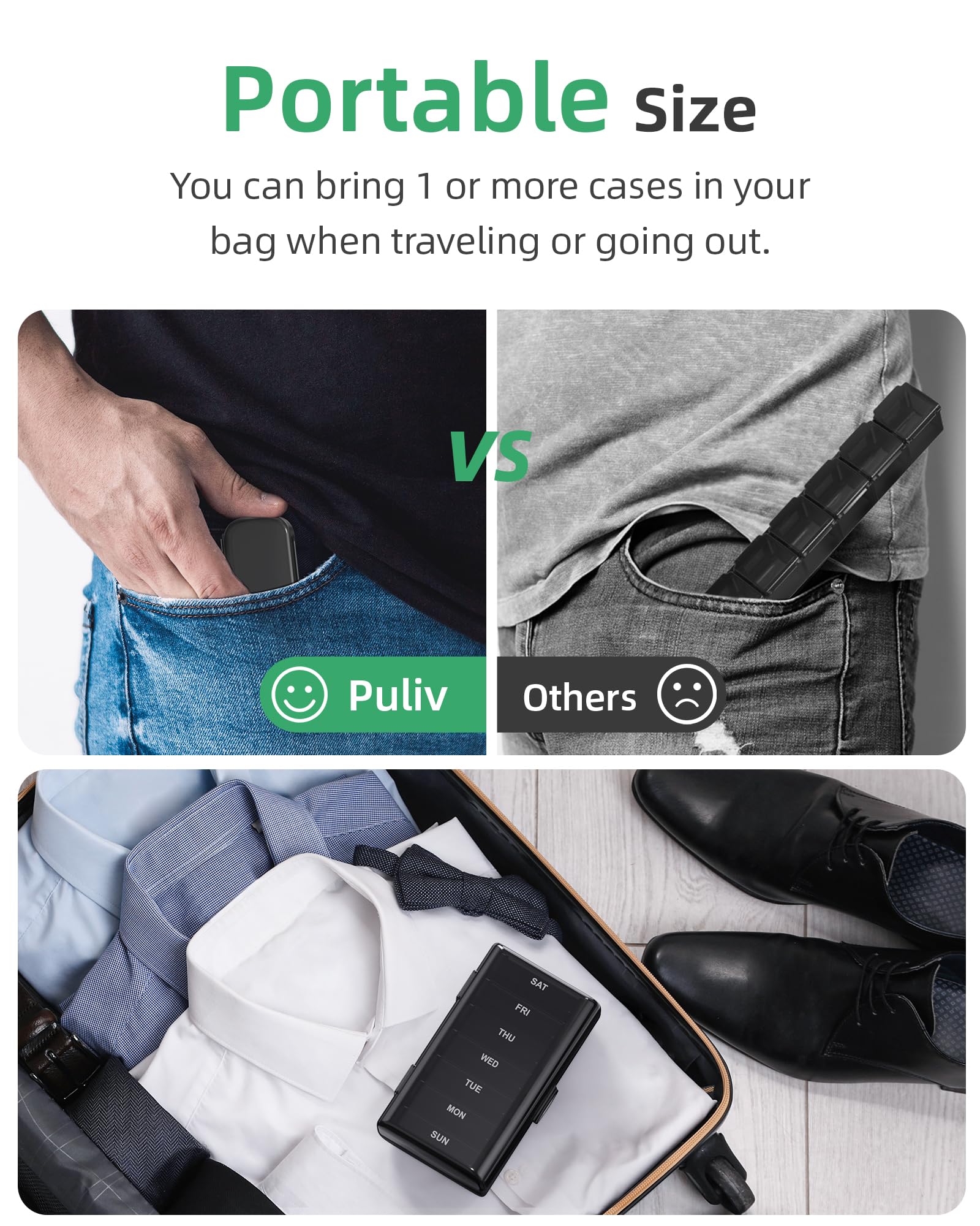 - Travel-friendly 7 Day Pill Case: The inner travel pill containers in compact design can be easily put into a purse or pocket. This pill holder also comes with an extra protective case for dual protection, so no more accidental medicine spillage on travel.