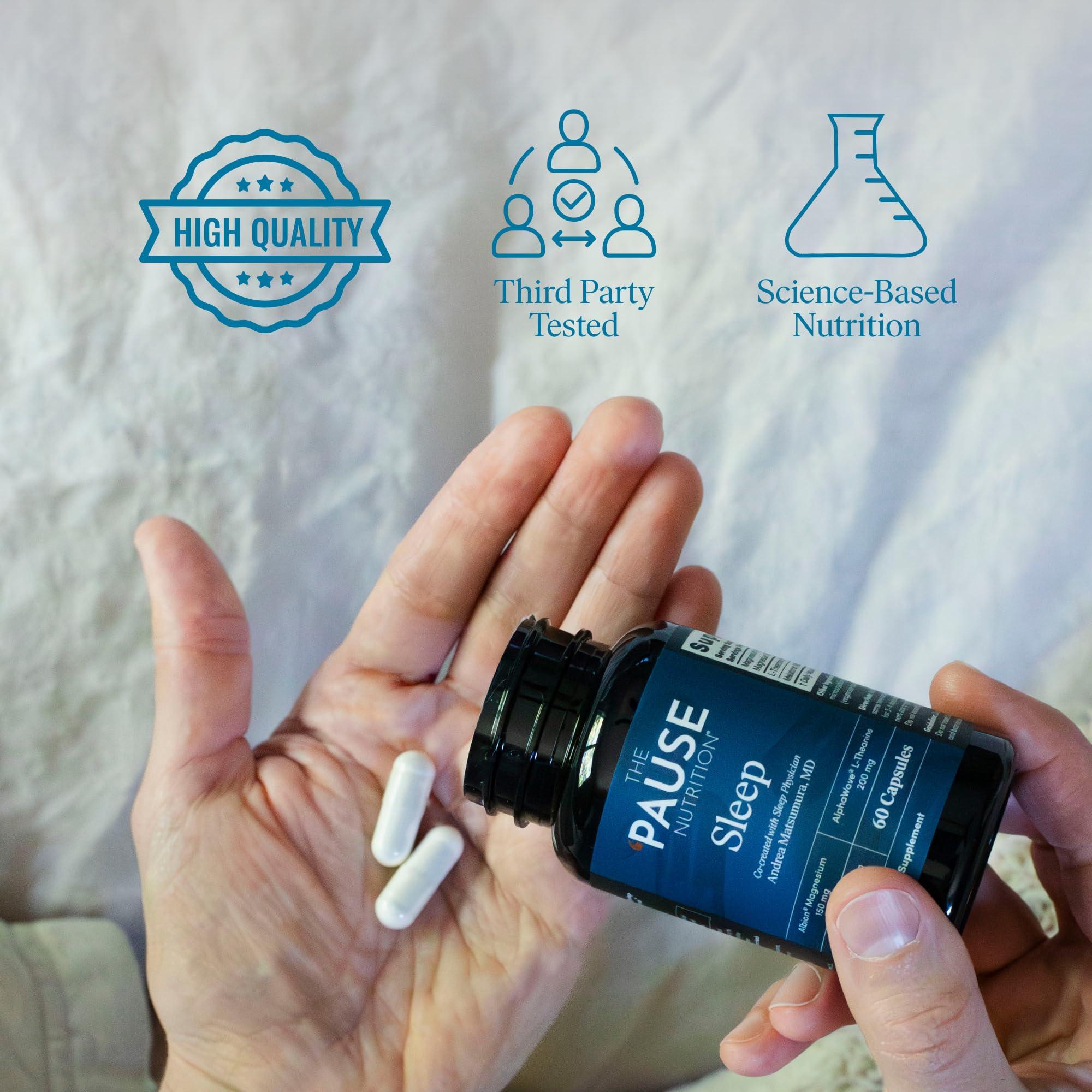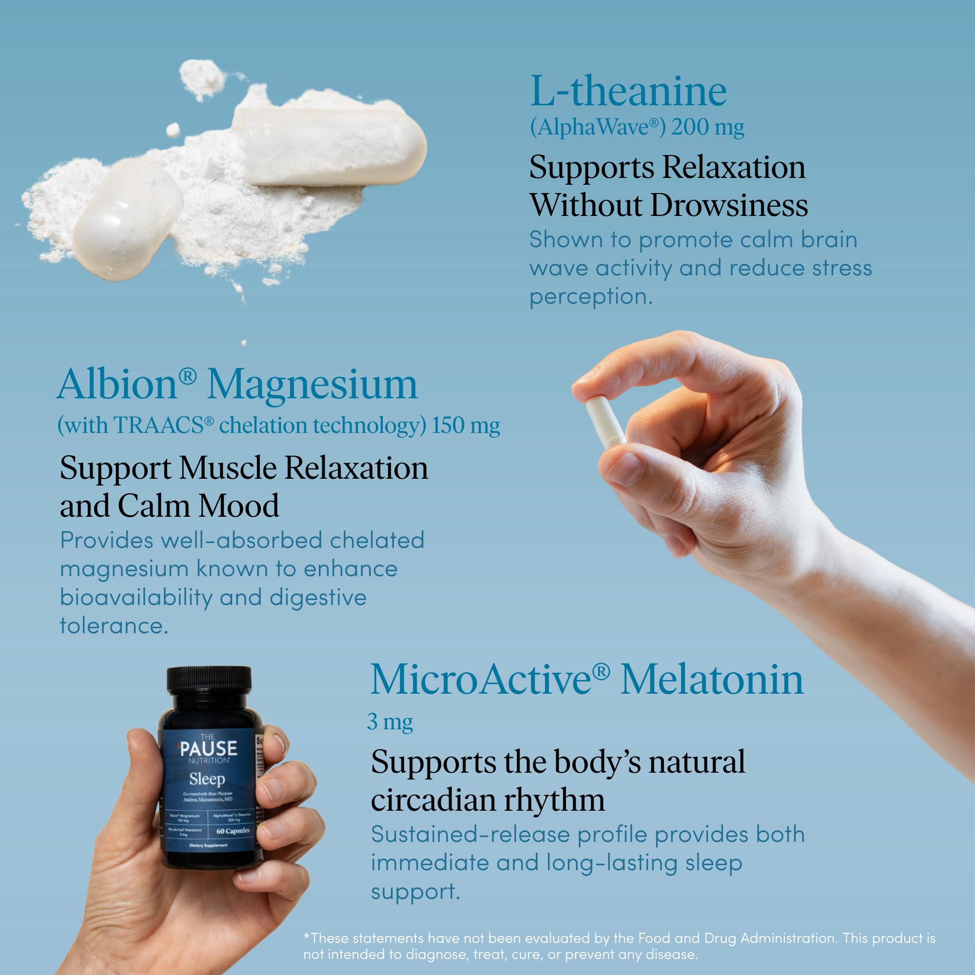 • For Restful Sleep: The ’Pause Life Sleep supplement was co-created by Dr. Mary Claire and Sleep Physician Andrea Matsumura, MD. This formula combines AlphaWave L-Theanine, Albion Magnesium, and MicroActive Melatonin to support natural sleep rhythms.