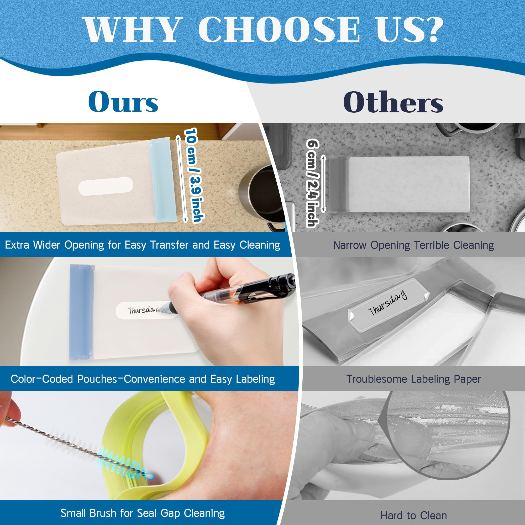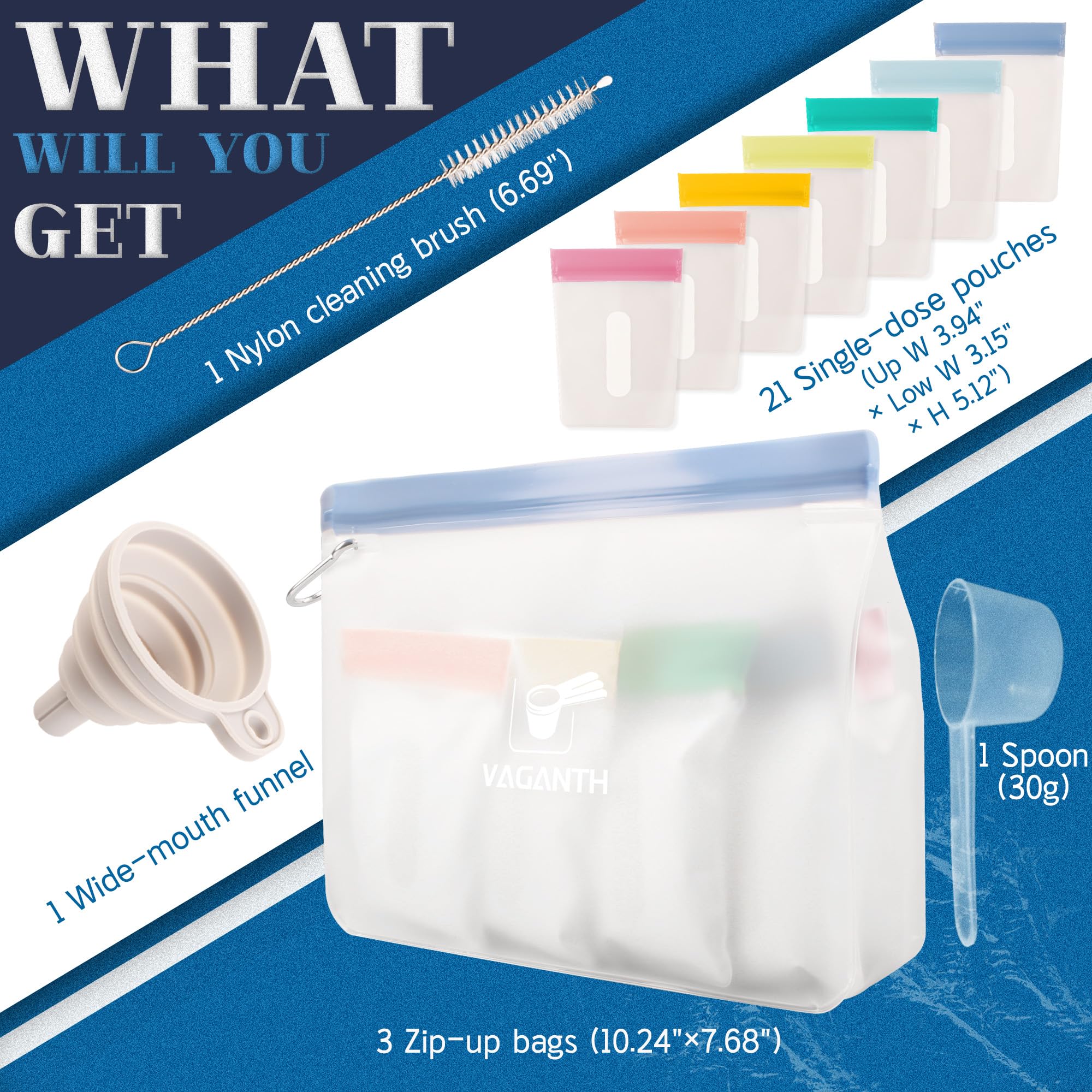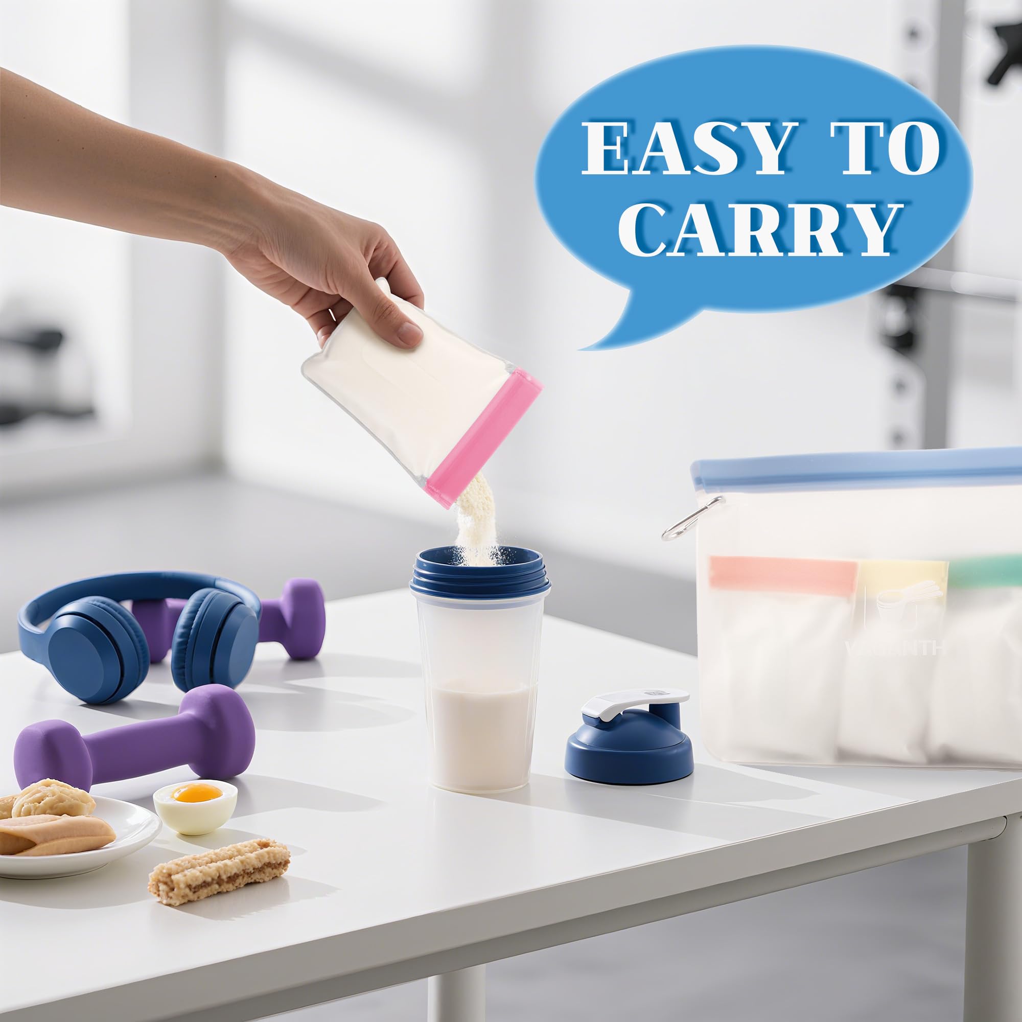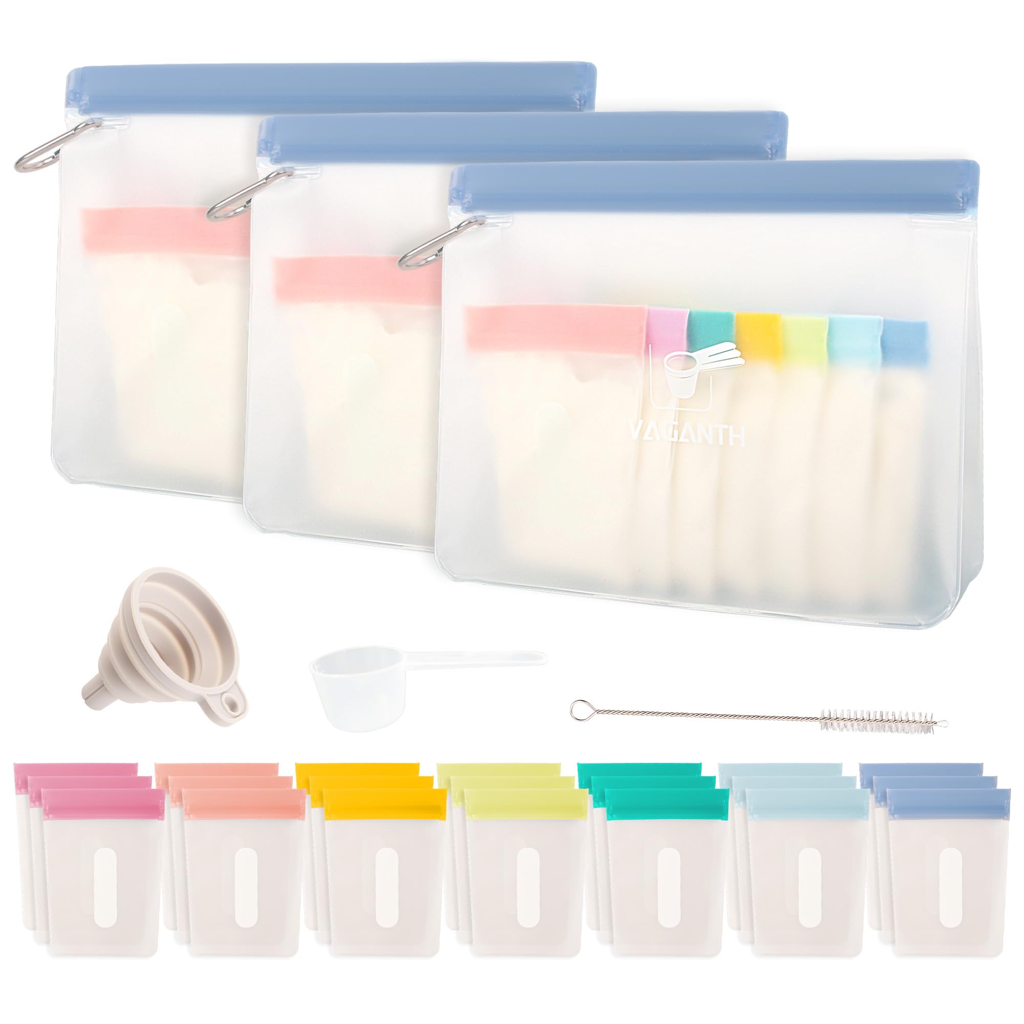 - PROTEIN POWDER TRAVEL CONTAINER SETS- The protein powder travel containers is upgraded designed for on-the-go fitness enthusiasts, featuring 21pc (3.94”x 5.12”) single dose bags and 3pc (10.24” x 7.68”) extra larger zip bags. Every single gym powder packets are color coded for convenience and easy labeling and the attached small brush make it easy for cleaning.